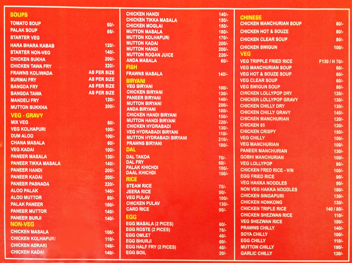 Indian Restaurant Menu and Price List for Chembur, Mumbai