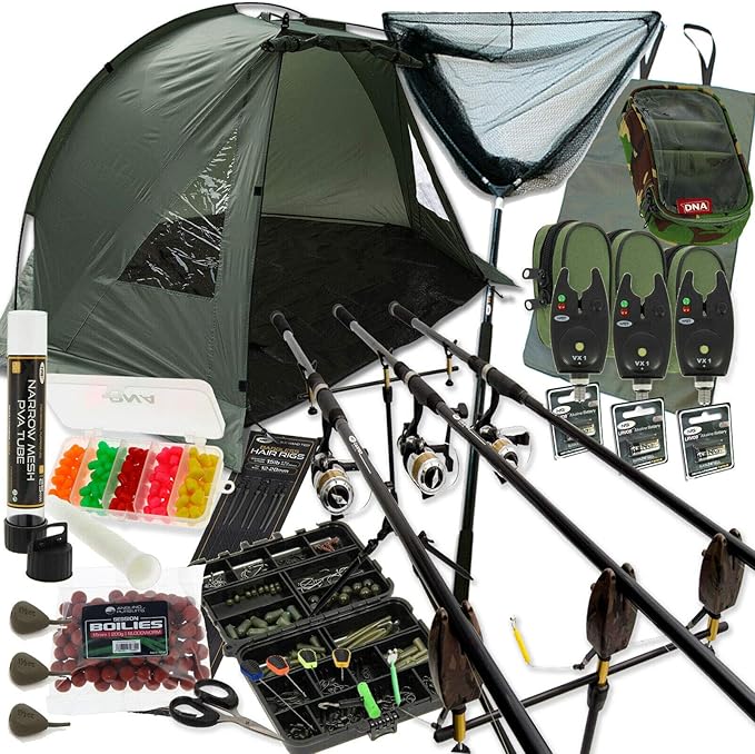 DNA Complete Carp Fishing Set up with Shelter Bivvy Rods Reels Alarms Net & Tackle (2Rod Setup