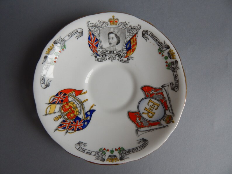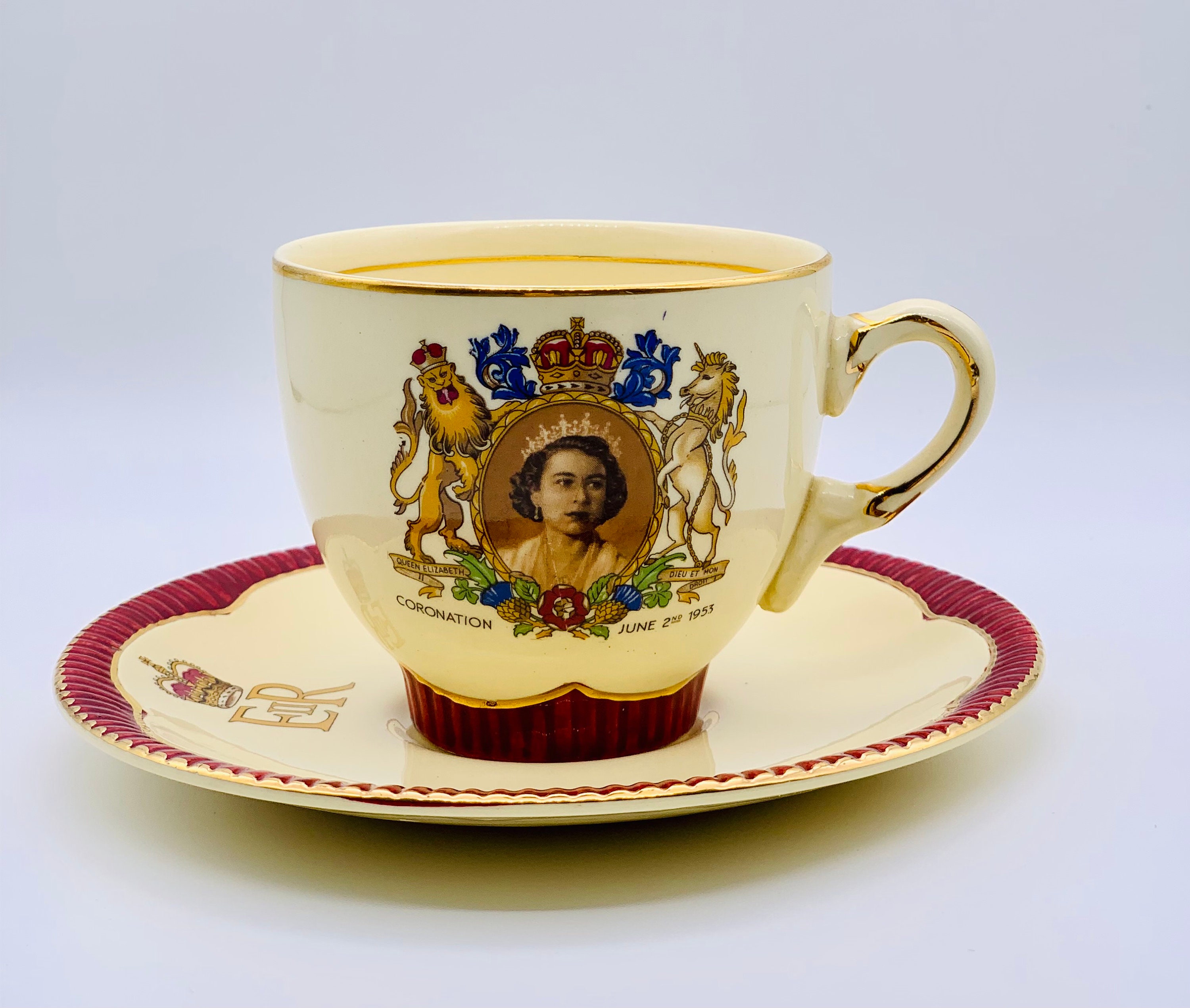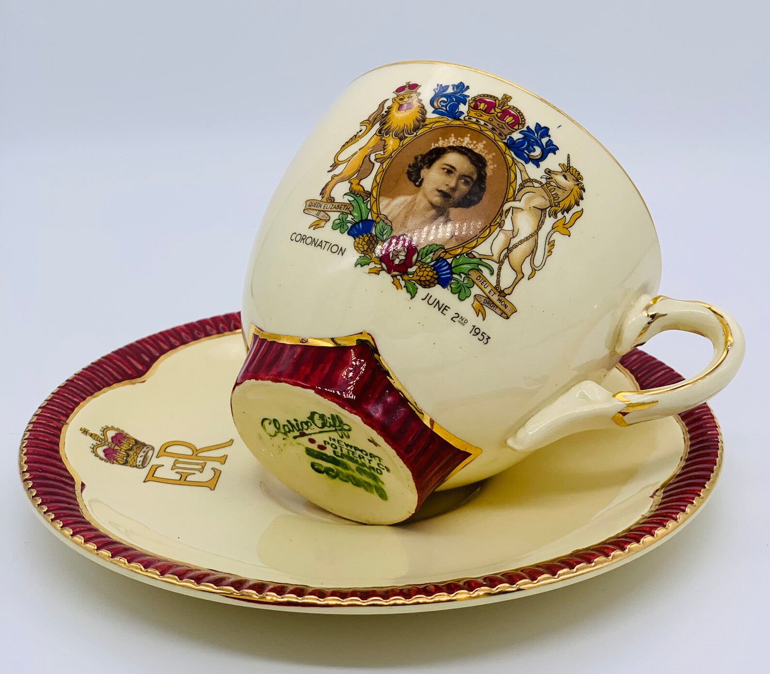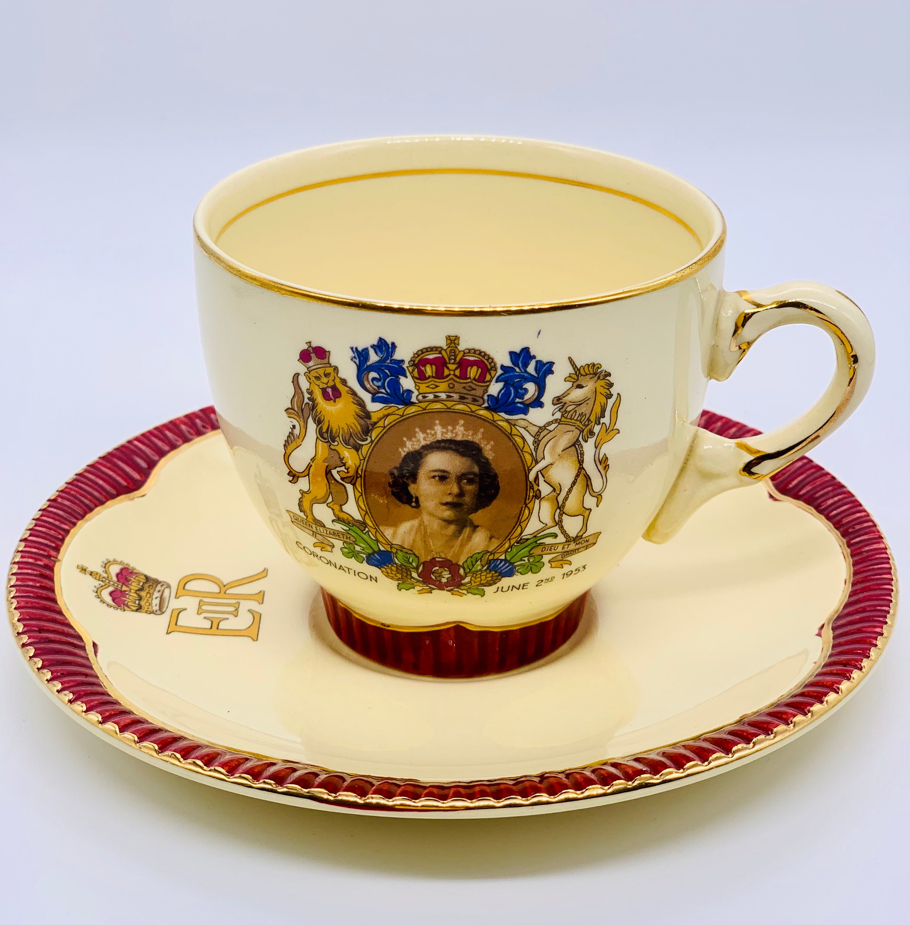 Shelley Teacup and Saucer with Queen Elizabeth 1953 Coronation, English Collectible Vintage Tea Set, Mothers Day Gift Idea. (1.2k) $48.00. $60.00 (20% off) FREE shipping. Queen Elizabeth 11 Coronation 1953 Tea Set Trio - Commemorative Ware- Alfred Meakin Cream China. Cup, Saucer & Plate .