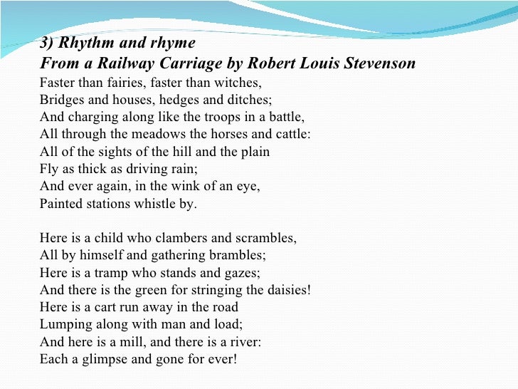 From a Railway Carriage. by Robert Louis Stevenson. Faster than fairies, faster than witches, Bridges and houses, hedges and ditches; And charging along like troops in a battle. All through the meadows the horses and cattle: All of the sights of the hill and the plain. Fly as thick as driving rain; And ever again, in the wink of an eye,