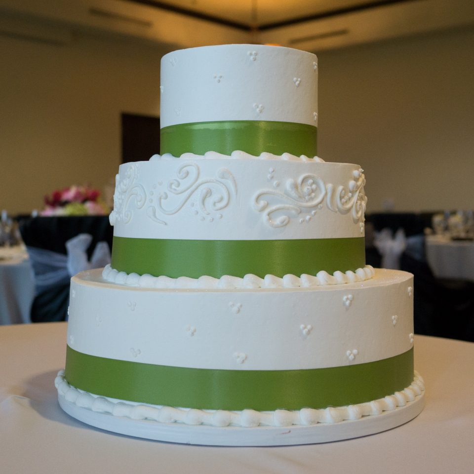 Photo of a green ribbon white wedding cake Patty's Cakes and Desserts