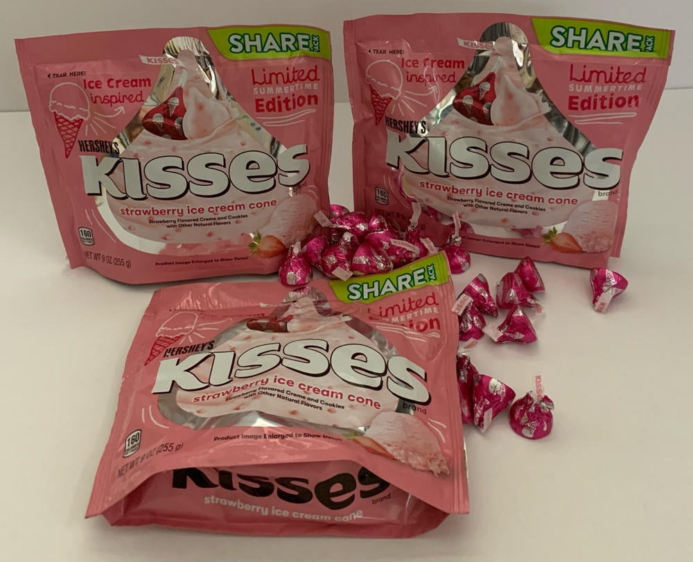 Hershey's Strawberry Ice Cream Cone Kisses . Summer and ice cream are synonymous, so a seasonal Hershey's Kiss that mimics an iconic ice cream cone flavor makes a lot of sense. These strawberry-flavored creme Kisses have bits of cookies throughout, giving you the taste of strawberry ice cream and the crunch of a cone with each candy you pop.
