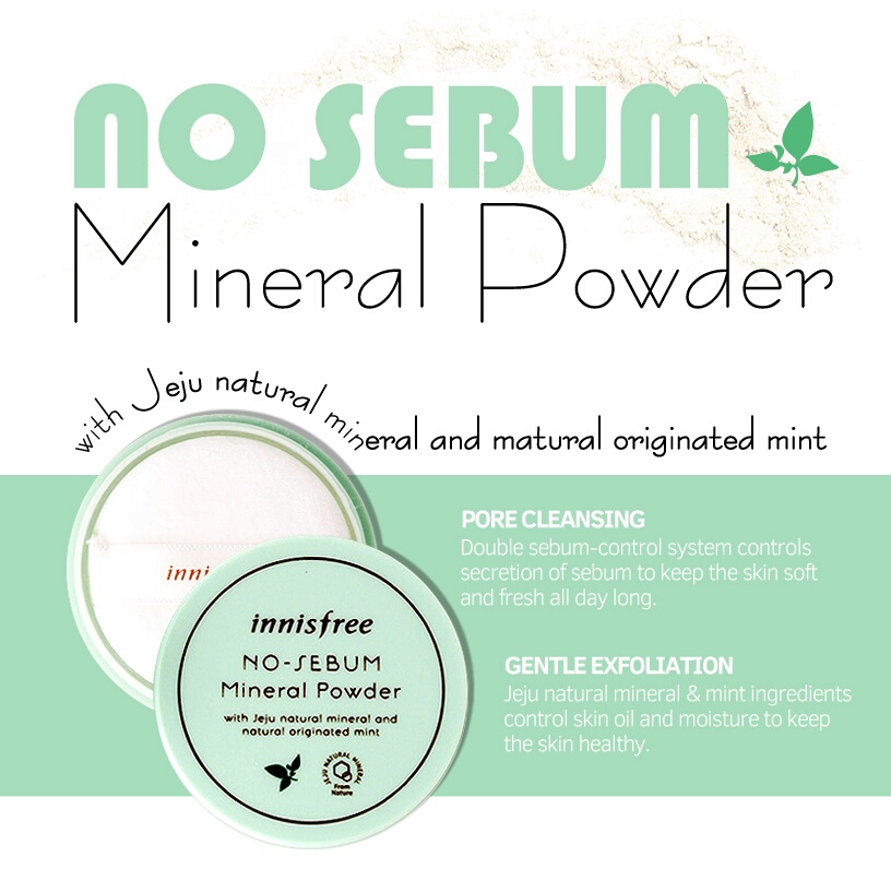 ⓒ 2020 innisfree Inc.. No-Sebum Mineral Powder 5g. Shop Online. Mall Close + Product Overview; Reviews(98) Product Details. A replacement for oil control paper that leaves the skin soft and matte 1. The double sebum-control system controls the secretion of sebum to keep the skin soft and fresh all day long. 2. Jeju minerals and mint.
