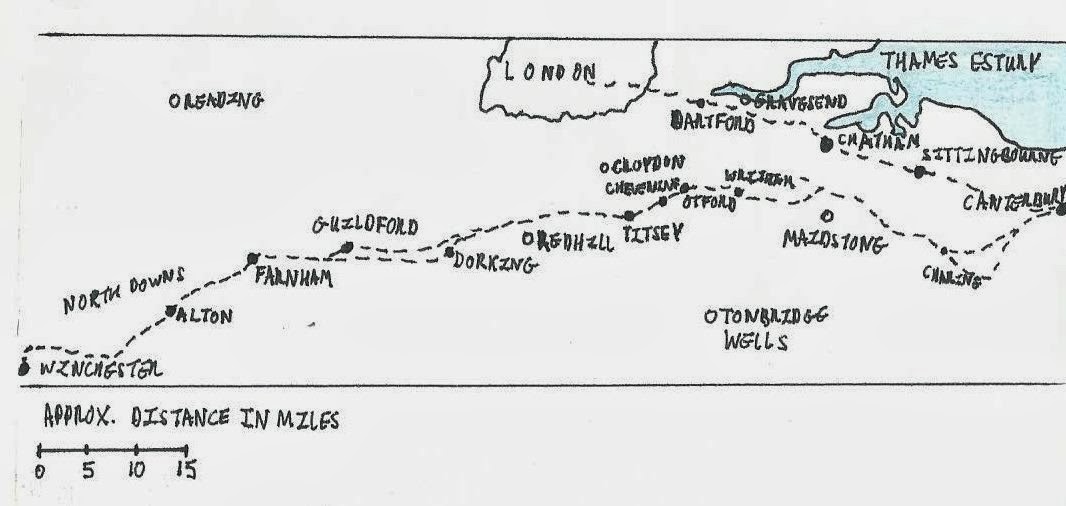 The Pilgrims' Way (also Pilgrim's Way or Pilgrims Way) is the historical route supposedly taken by pilgrims from Winchester in Hampshire, England, to the shrine of Thomas Becket at Canterbury in Kent.This name, of comparatively recent coinage, is applied to a pre-existing ancient trackway dated by archaeological finds to 600-450 BC, but probably in existence since the Stone Age.