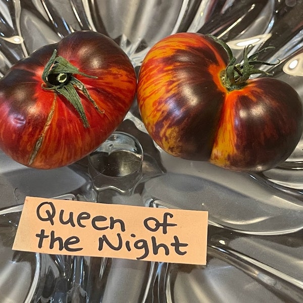 6,02. €. 7,08. BUY. Tomato Queen of the Night fresh seeds, Tomato seeds, Vegetable seeds, Organic seeds, Heirloom tomato, Non GMO. Medium-ripened, medium-sized, exotic tomato variety for greenhouses and open ground. The bush is powerful, up to 1 meter high in the open ground, in the greenhouse — a little higher.
