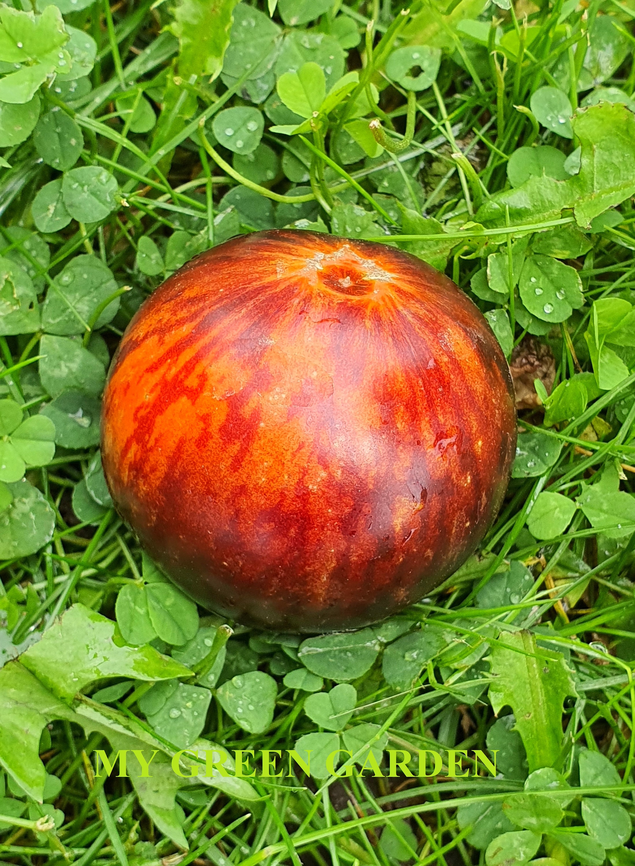 Round red orange striped fruits with very strong blue-black influences on the upper half from anthocyanin. The more the fruits are exposed to sunlight, the stronger this antioxidant (the same as blue berries) the more the fruits will turn blue / black. Dense flesh but very juicy with a strong tomato flavour. Minimum 20 seeds.