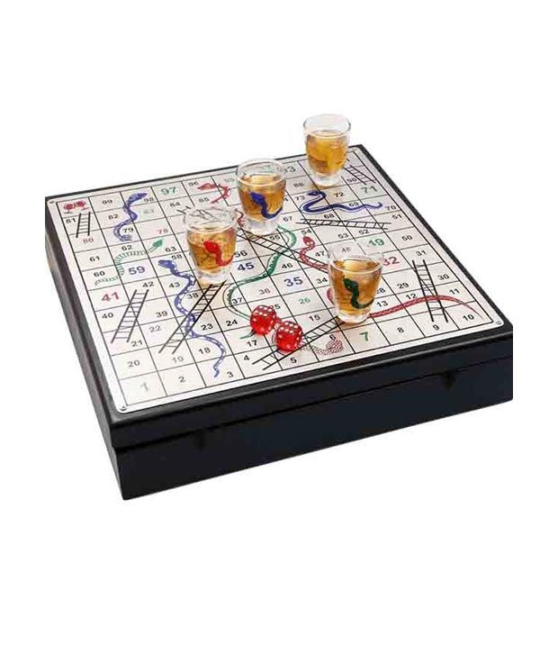 Snakes & Ladders Drinking Game Description. A fun drinking game based on the family classic for up to 6 players; Drink your way up or drink you way down. Either way; take a shot! Includes 6 shot glasses; frosted glass game board and one playing dice; Approx. Dimensions (Packaging): 33 (H) x 8 (W) x 33 (D) cm / 13.1 (H) x 3.2 (W) x 13.1 (D) inches.