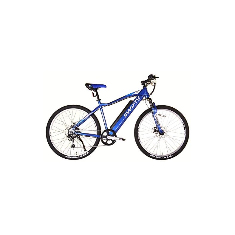 Swifty Electric Mountain Bike. This 7 speed full size electric mountain bike features a Panasonic 36V 9.6AH Lithium ion battery and powerful 250 watt electric motor giving you a top assist speed of 15mph and a range up to a solid 30 miles. An aluminium frame coupled with front suspension forks and knobbly off road tyres make any road or track.