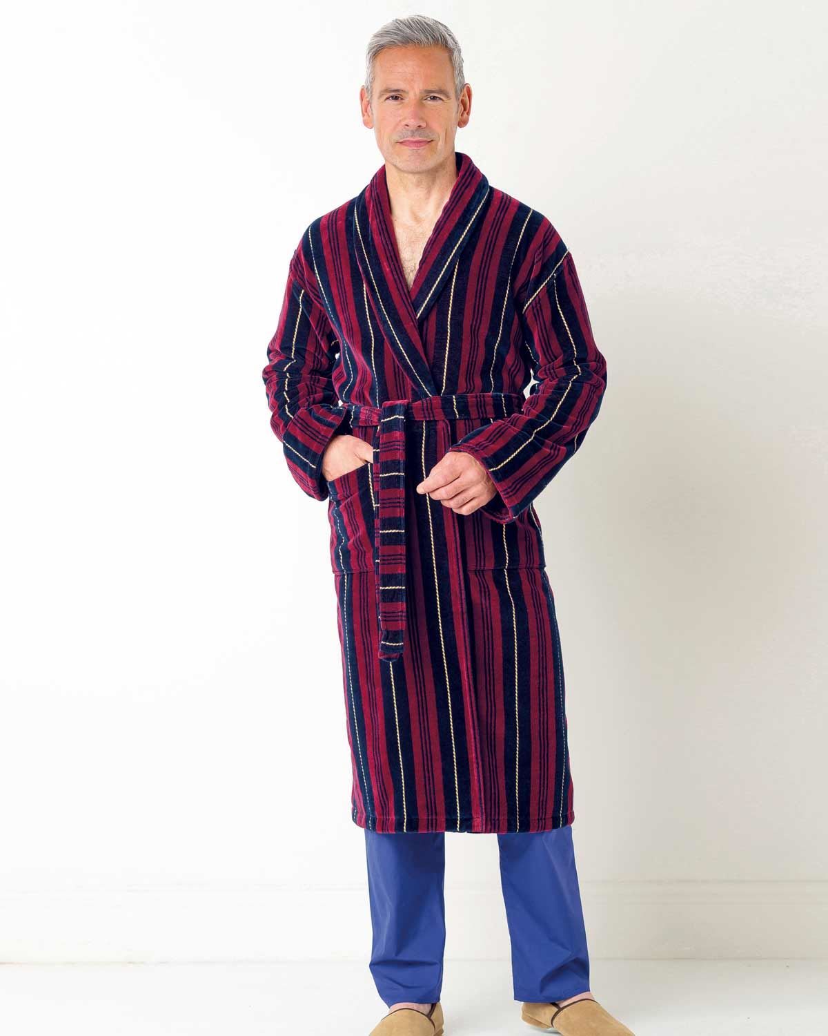 Cotton Rich Striped Velour Dressing Gown Burgundy Mix Skigen